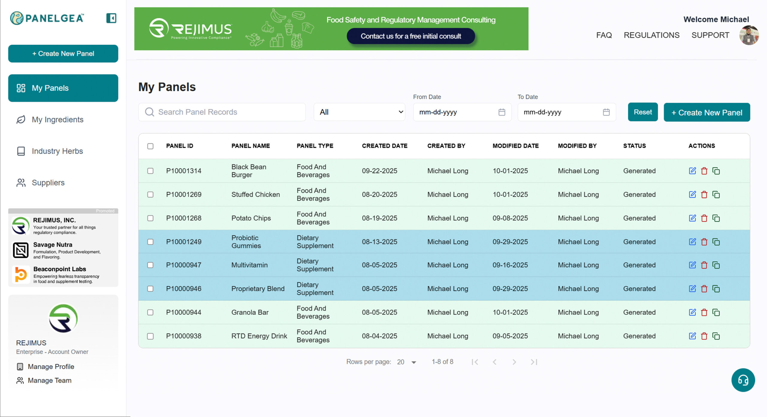 Add and manage unlimited private customizable ingredient records specific to your CPG products with detailed nutritional information. Customize your ingredients by creating multiple ingredient record variations for unlimited use. Leverage Panelgea® Verified ingredients for claim substantiation and formulation uniqueness.